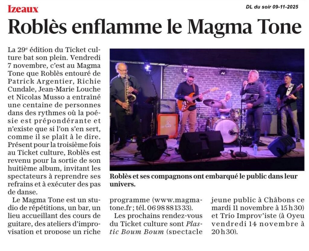 La poésie n’existe que si l’on s’en sert. Ce qui n’est pas dit n’existe pas. Disons tout. Un concert ROBLES c’est de la création, mais pas d’imitation. Une critique sociale et poétique de notre monde, encouragée par une formation de musiciens poussant le rythme jusque dans le coin des murs.